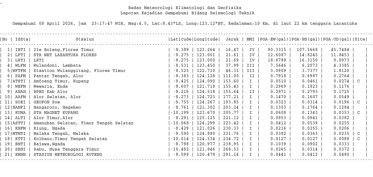 Detail Event — 20260408231747 - Info Gempa dirasakan Mag:4.7, 08-Apr-26 23:17:47 WIB, Lok:8.43 LS, 123.12 BT (Pusat gempa berada di darat 22 km tenggara Larantuka), Kedlmn:10 Km ::BMKG