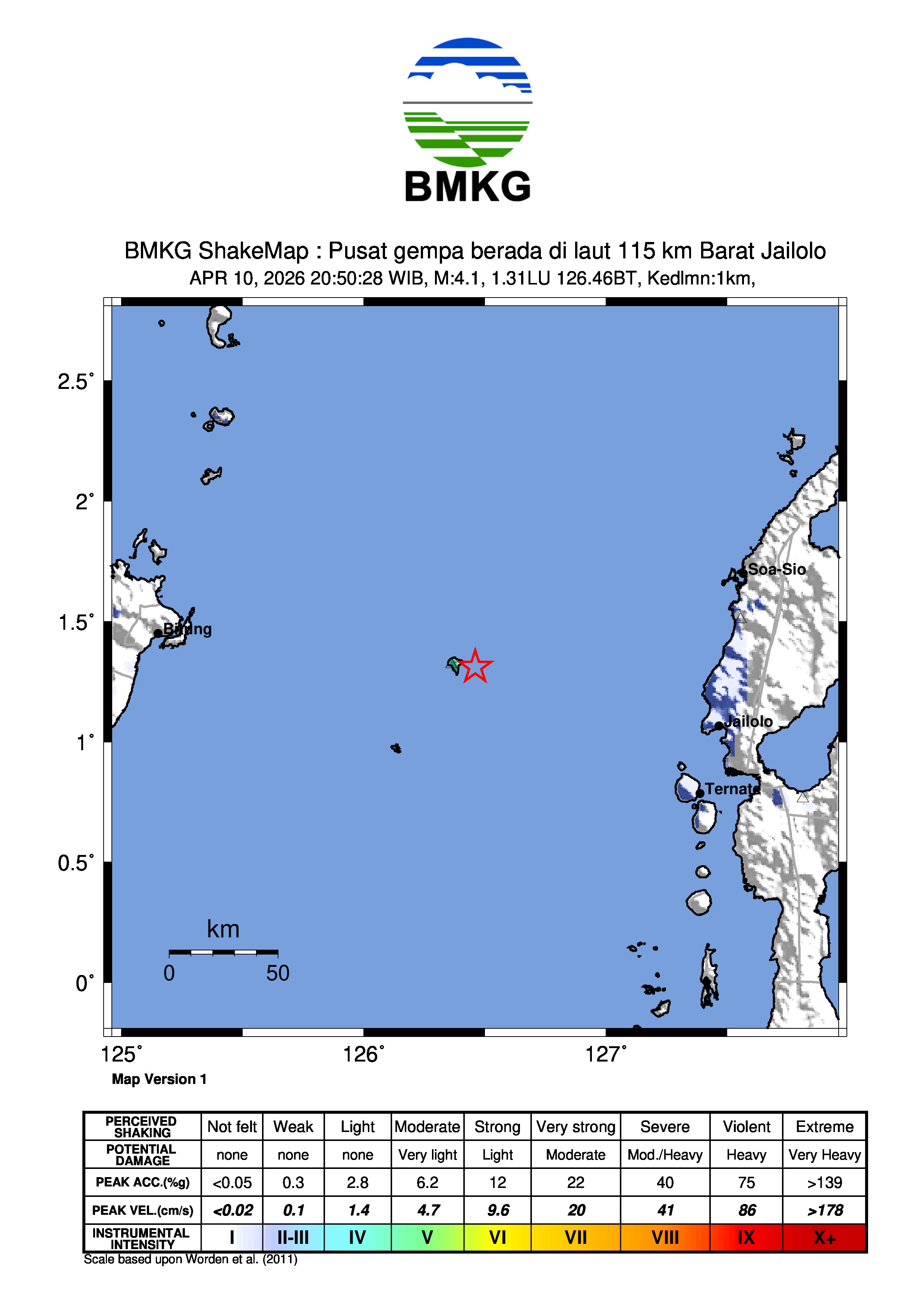 Info Gempa dirasakan Mag:4.1, 10-Apr-26 20:50:28 WIB, Lok:1.31 LU, 126.46 BT (Pusat gempa berada di laut 115 km Barat Jailolo), Kedlmn:1 Km ::BMKG