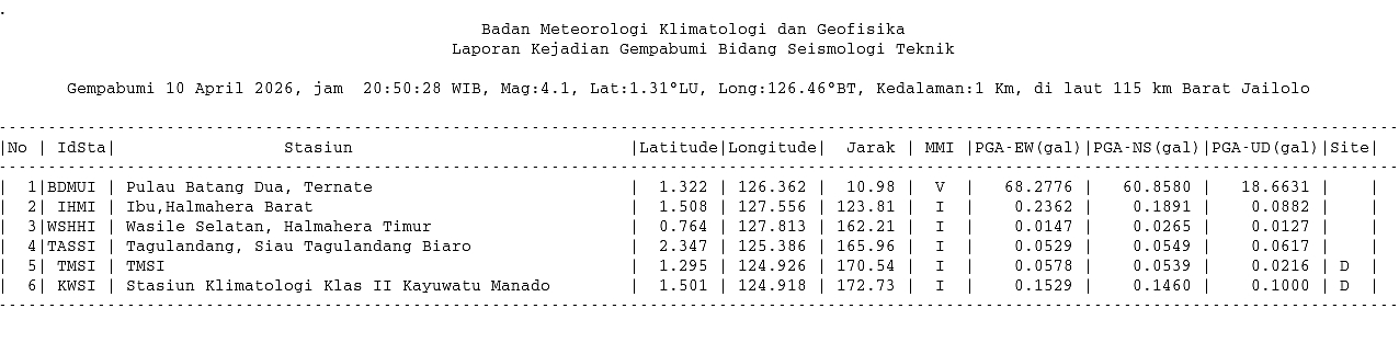 Detail Event — 20260410205028 - Info Gempa dirasakan Mag:4.1, 10-Apr-26 20:50:28 WIB, Lok:1.31 LU, 126.46 BT (Pusat gempa berada di laut 115 km Barat Jailolo), Kedlmn:1 Km ::BMKG
