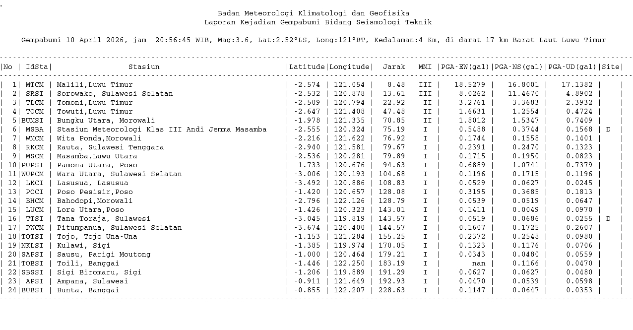 Detail Event — 20260410205645 - Info Gempa dirasakan Mag:3.6, 10-Apr-26 20:56:45 WIB, Lok:2.52 LS, 121.00 BT (Pusat gempa berada di darat 17 km Barat Laut Luwu Timur), Kedlmn:4 Km ::BMKG
