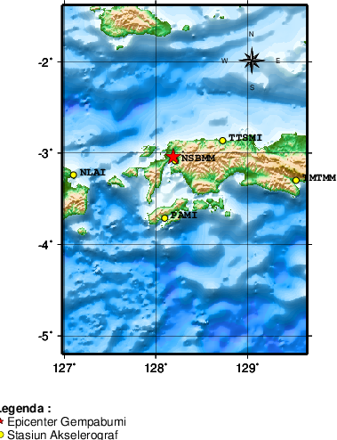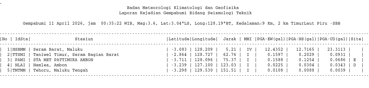 Info Gempa dirasakan Mag:3.3, 11-Apr-26 00:35:22 WIB, Lok:3.10 LS, 128.16 BT (Pusat gempa berada di laut 6 km Barat Daya Seram Bagian Barat), Kedlmn:5 Km ::BMKG
