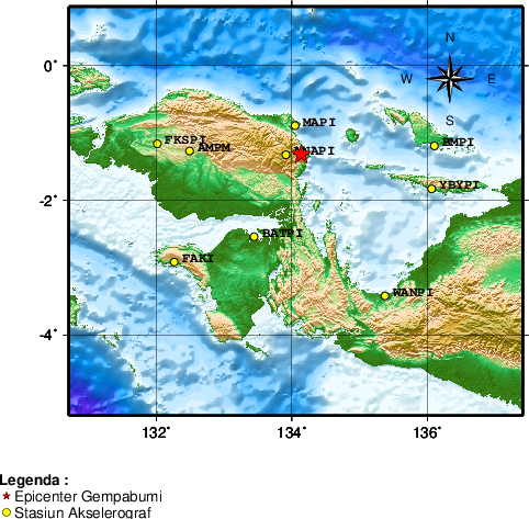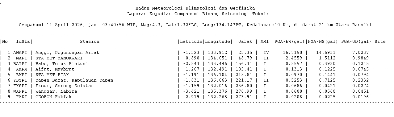Info Gempa dirasakan Mag:4.3, 11-Apr-26 03:40:56 WIB, Lok:1.32 LS, 134.14 BT (Pusat gempa berada di darat 21 km Utara Ransiki), Kedlmn:10 Km ::BMKG