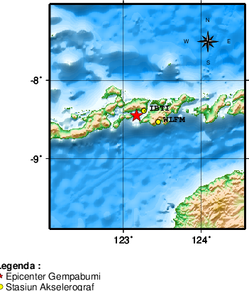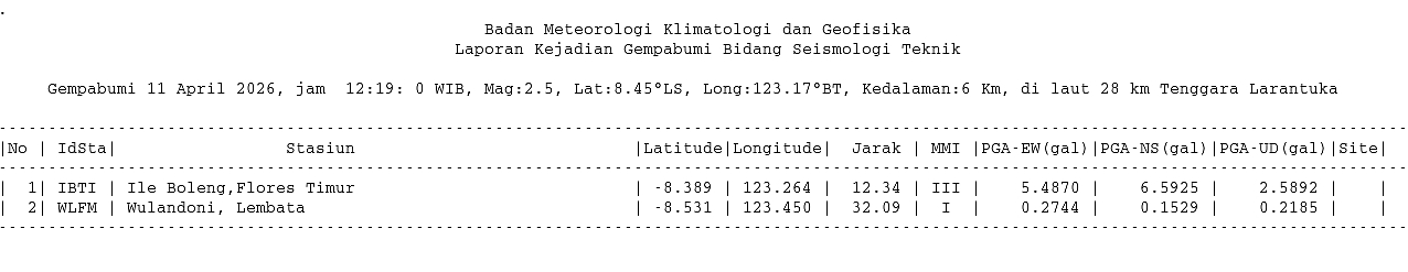 Detail Event — 20260411121900 - Info Gempa dirasakan Mag:2.5, 11-Apr-26 12:19:00 WIB, Lok:8.45 LS, 123.17 BT (Pusat gempa berada di laut 28 km Tenggara Larantuka), Kedlmn:6 Km ::BMKG