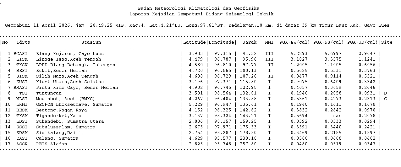 Info Gempa dirasakan Mag:4.0, 11-Apr-26 20:49:25 WIB, Lok:4.21 LU, 97.61 BT (Pusat gempa berada di darat 39 km Timur Laut Kab. Gayo Lues), Kedlmn:10 Km ::BMKG