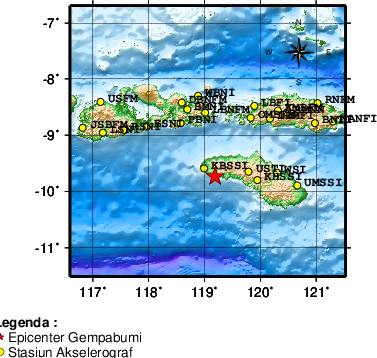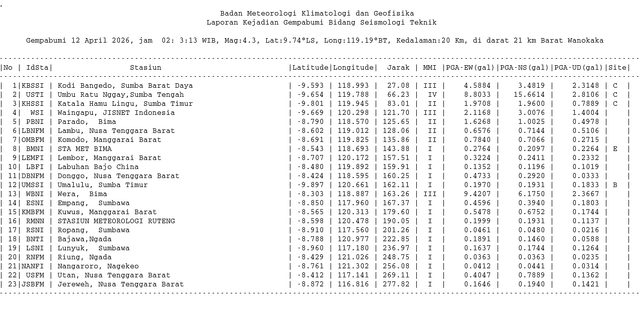 Detail Event — 20260412020313 - Info Gempa dirasakan Mag:4.3, 12-Apr-26 02:03:13 WIB, Lok:9.74 LS, 119.19 BT (Pusat gempa berada di darat 21 km Barat Wanokaka), Kedlmn:20 Km ::BMKG