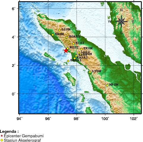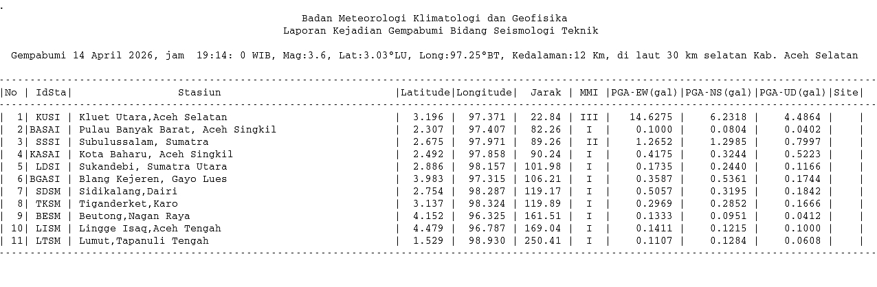 Detail Event — 20260414191400 - Info Gempa dirasakan Mag:3.6, 14-Apr-26 19:14:00 WIB, Lok:3.03 LU, 97.25 BT (Pusat gempa berada di laut 30 km selatan Kab. Aceh Selatan), Kedlmn:12 Km ::BMKG