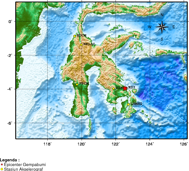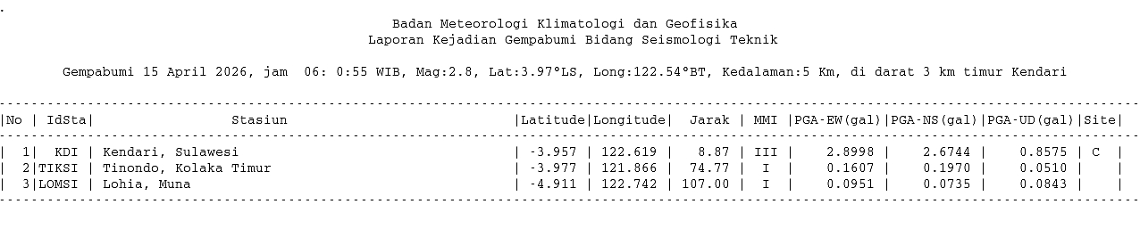 Detail Event — 20260415060055 - Info Gempa dirasakan Mag:2.8, 15-Apr-26 06:00:55 WIB, Lok:3.97 LS, 122.54 BT (Pusat gempa berada di darat 3 km timur Kendari), Kedlmn:5 Km ::BMKG