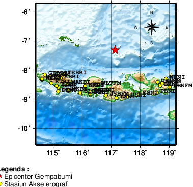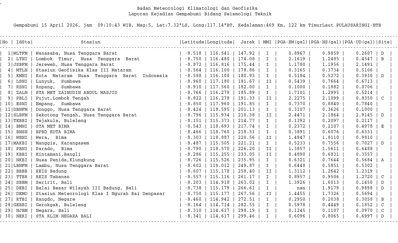 Info Gempa dirasakan Mag:5.0, 15-Apr-26 09:10:43 WIB, Lok:7.32 LS, 117.14 BT (Pusat gempa berada di laut 122 km Timur Laut Pulau Saringi), Kedlmn:469 Km ::BMKG