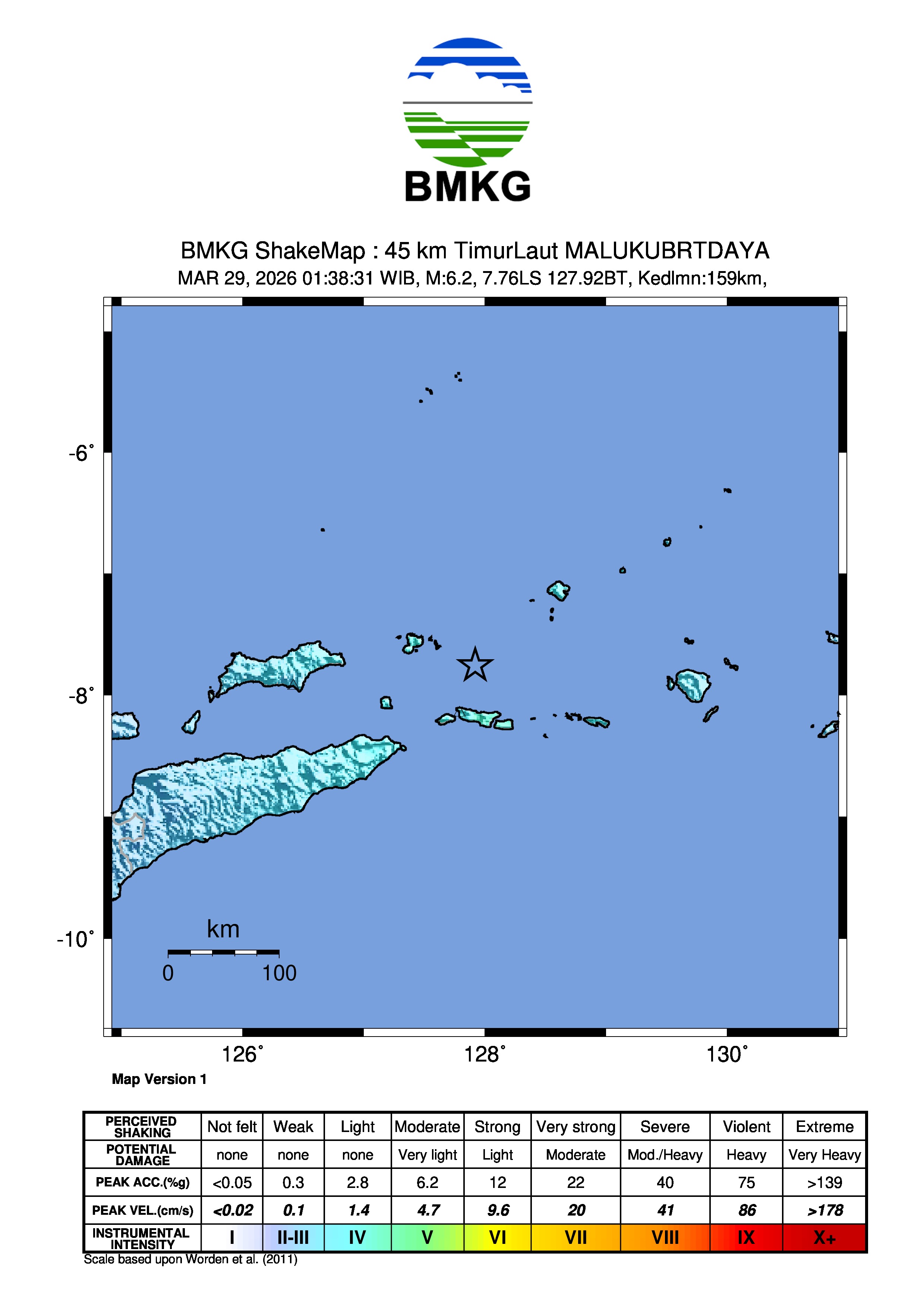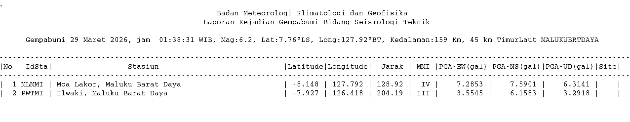 Info Gempa Mag:6.5, 29-Mar-26 01:38:32 WIB, Lok:7.73 LS, 127.89 BT (48 km TimurLaut MALUKUBRTDAYA), Kedlmn:141 Km ::BMKG