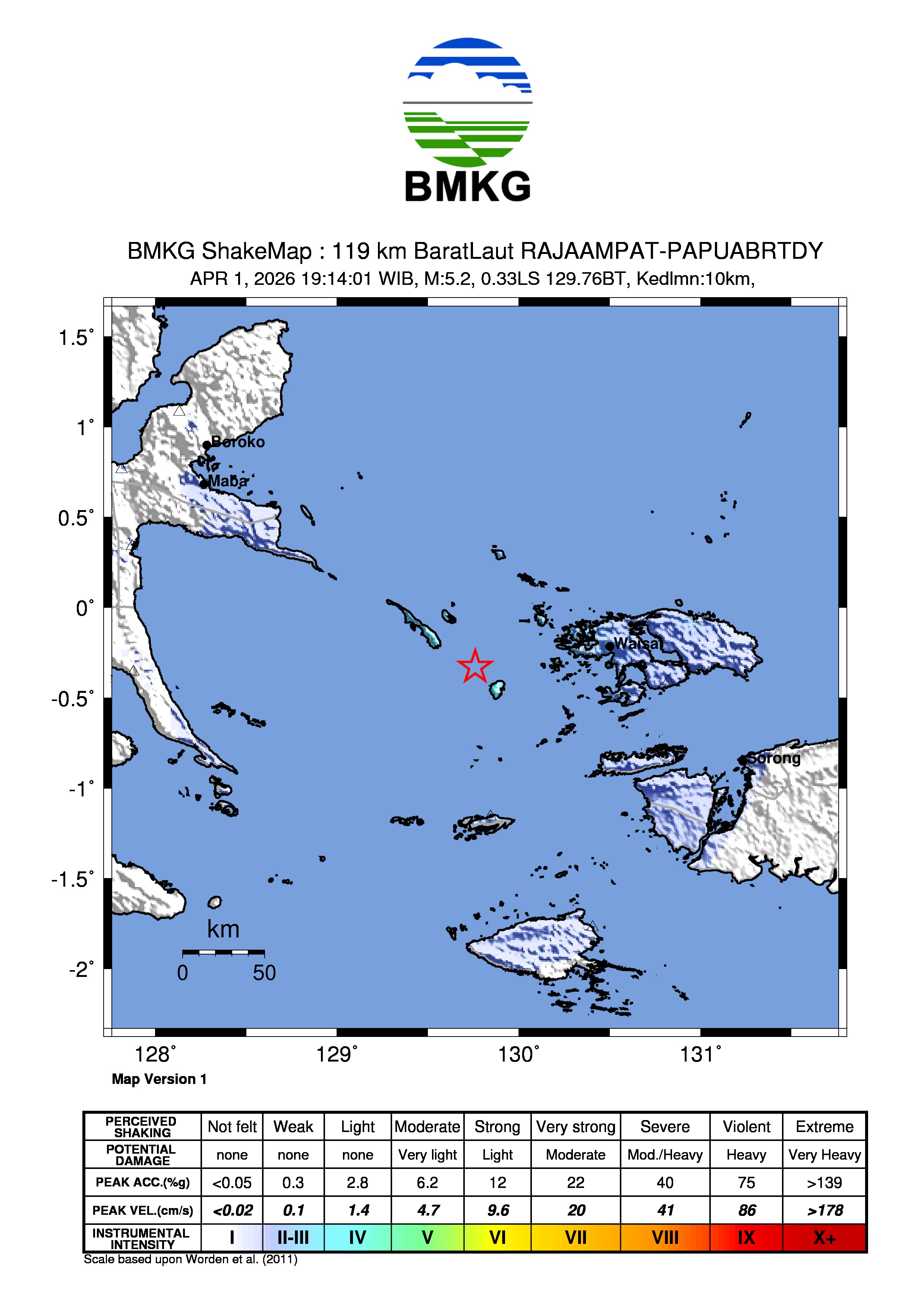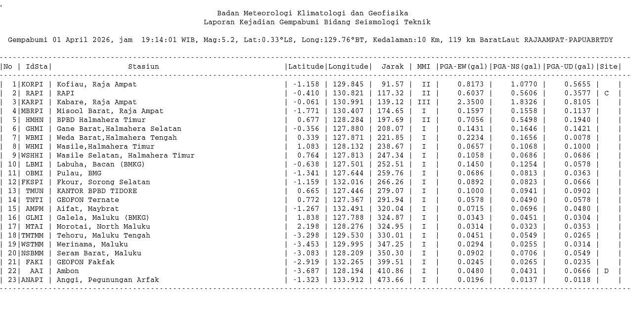 Info Gempa Mag:5.2, 01-Apr-26 19:14:01 WIB, Lok:0.32 LS, 129.76 BT (119 km BaratLaut RAJAAMPAT-PAPUABRTDY), Kedlmn:10 Km ::BMKG