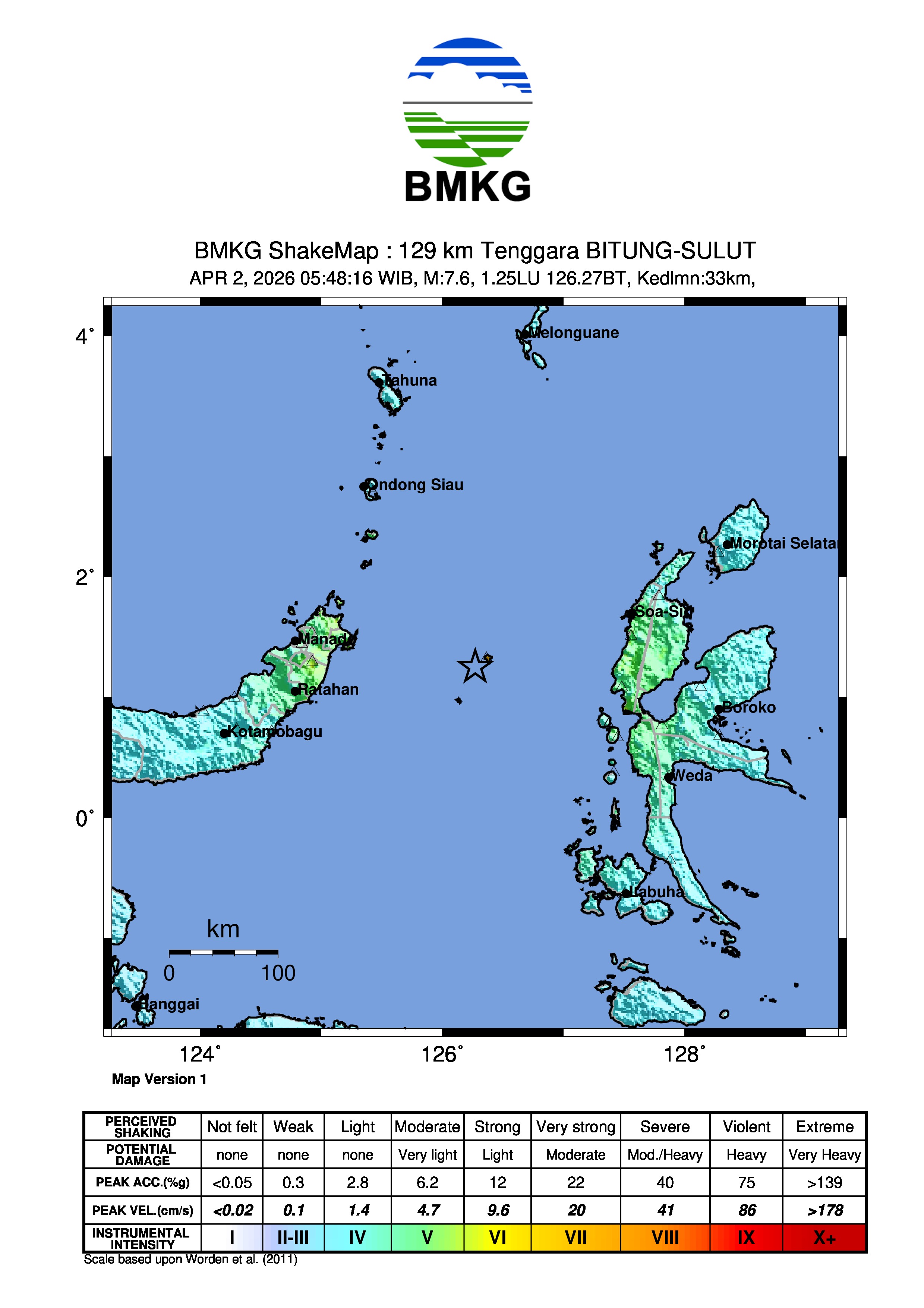 Info Gempa Mag:7.3, 02-Apr-26 05:48:14 WIB, Lok:1.21 LU, 126.25 BT (127 km Tenggara BITUNG-SULUT), Kedlmn:18 Km ::BMKG
