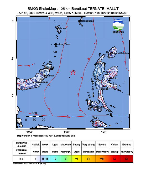 Info Gempa Mag:5.2, 02-Apr-26 06:12:34 WIB, Lok:1.23 LU, 126.33 BT (125 km BaratLaut TERNATE-MALUT), Kedlmn:27 Km ::BMKG