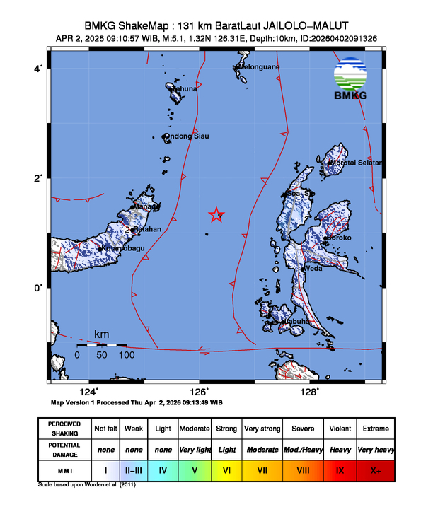 Info Gempa Mag:5.1, 02-Apr-26 09:10:57 WIB, Lok:1.32 LU, 126.31 BT (131 km BaratLaut JAILOLO-MALUT), Kedlmn:10 Km ::BMKG