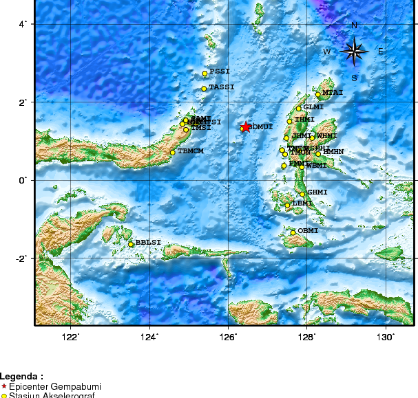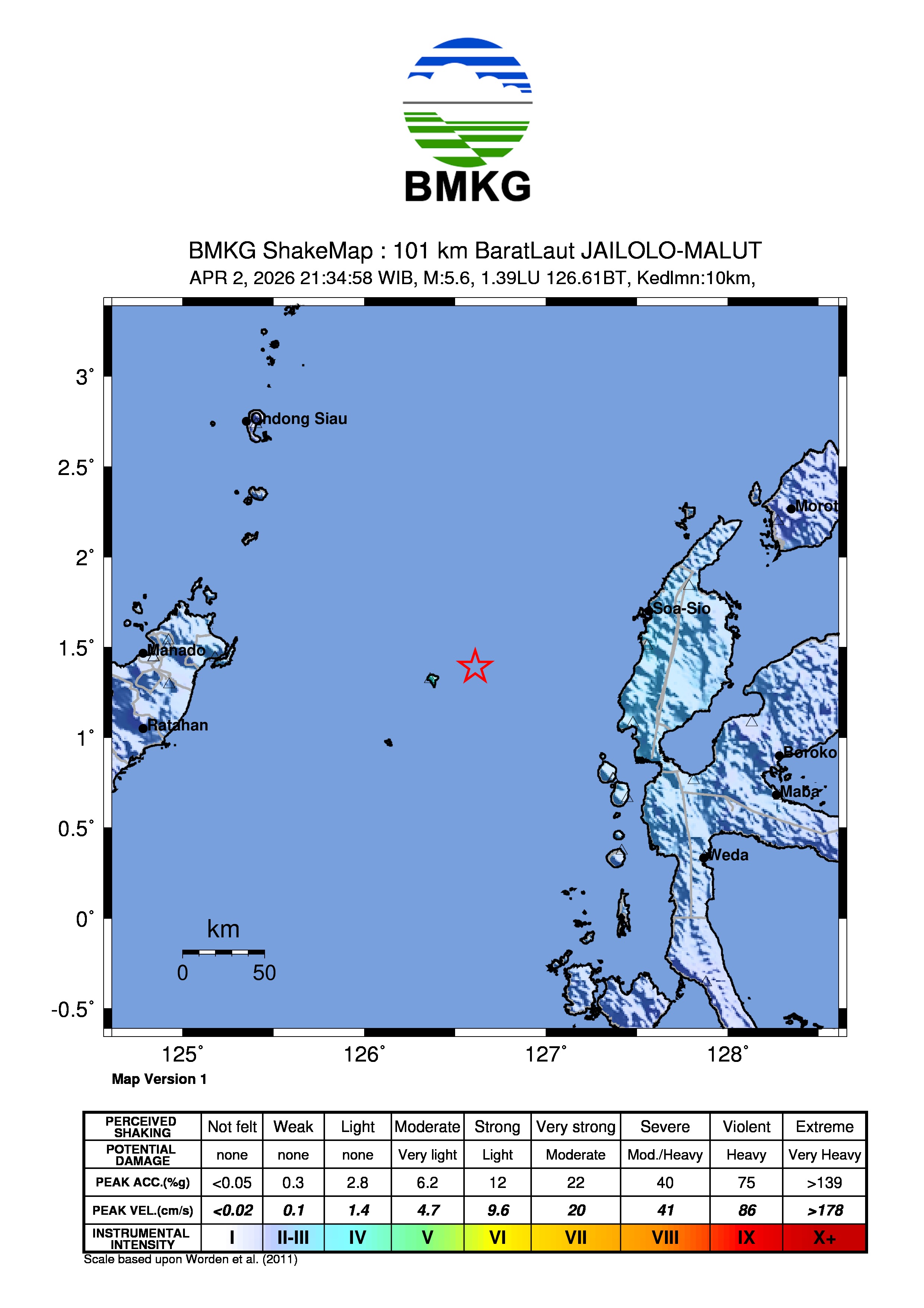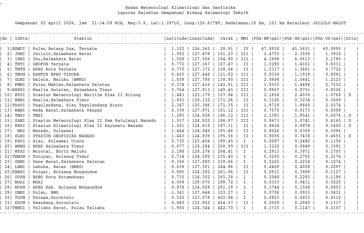 Info Gempa Mag:5.7, 02-Apr-26 21:34:55 WIB, Lok:1.36 LU, 126.45 BT (117 km BaratLaut JAILOLO-MALUT), Kedlmn:10 Km ::BMKG