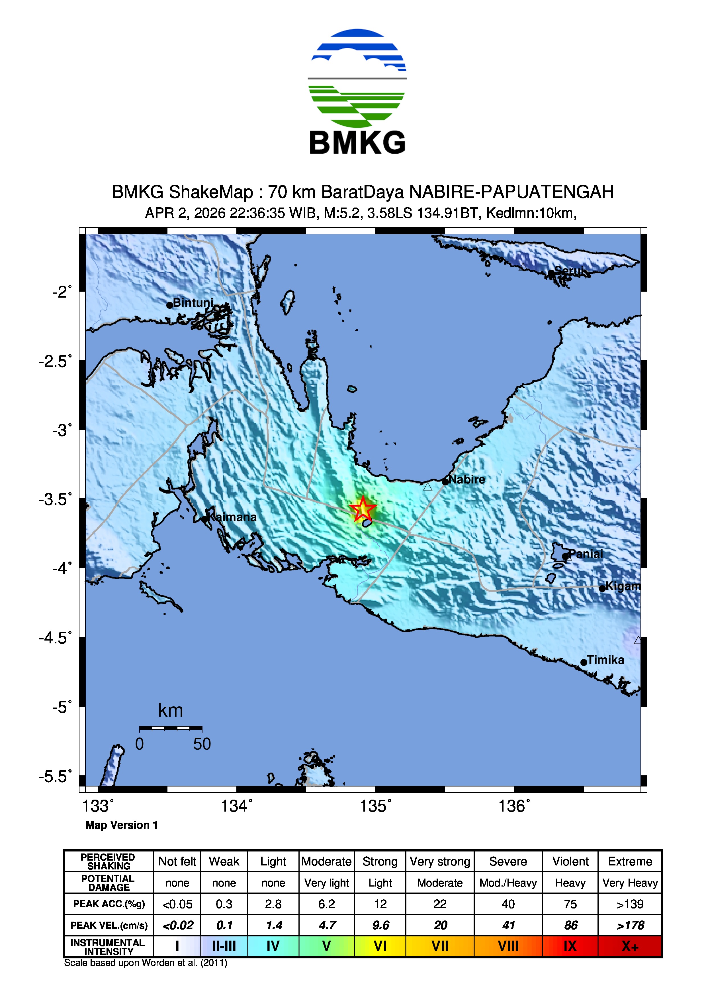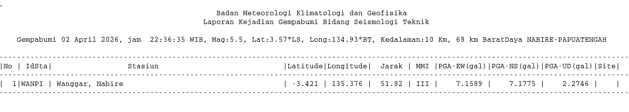 Info Gempa Mag:5.5, 02-Apr-26 22:36:35 WIB, Lok:3.57 LS, 134.93 BT (68 km BaratDaya NABIRE-PAPUATENGAH), Kedlmn:10 Km ::BMKG