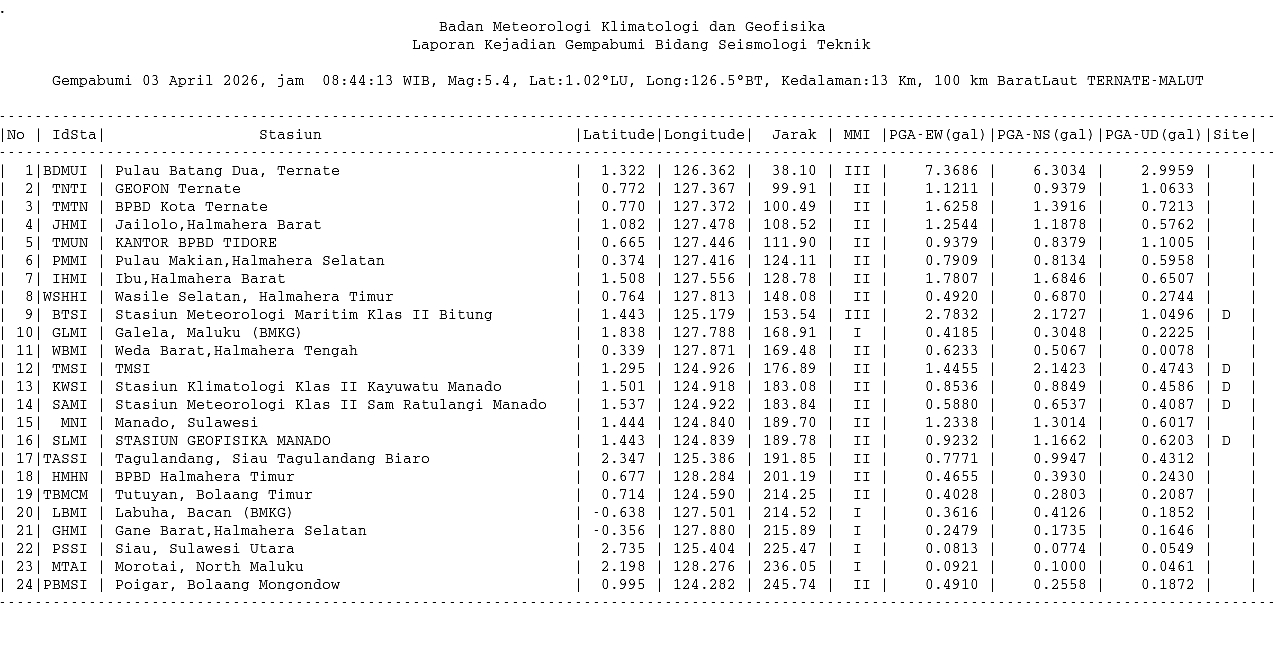 Info Gempa Mag:5.2, 03-Apr-26 08:44:12 WIB, Lok:1.00 LU, 126.47 BT (102 km BaratLaut TERNATE-MALUT), Kedlmn:10 Km ::BMKG