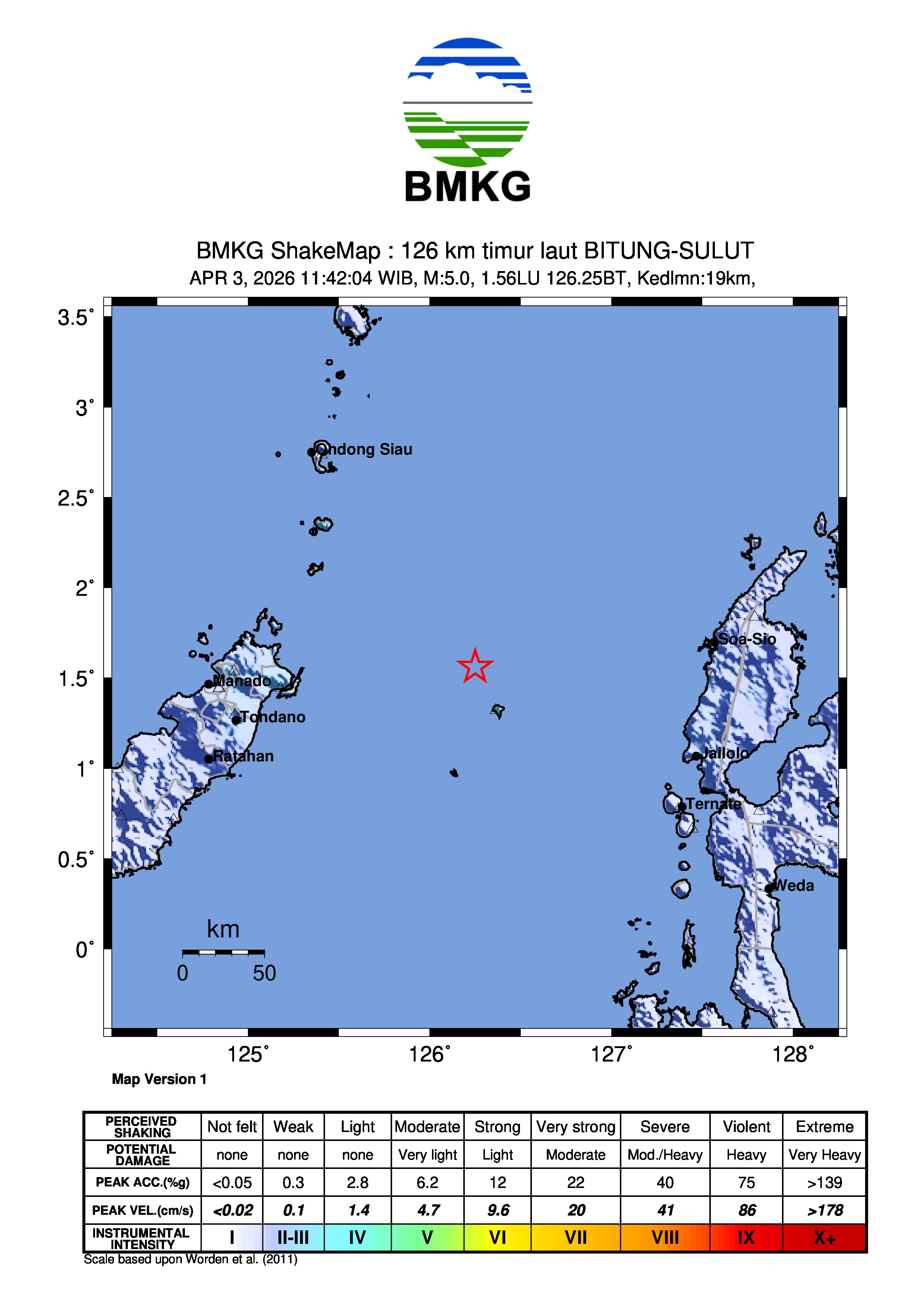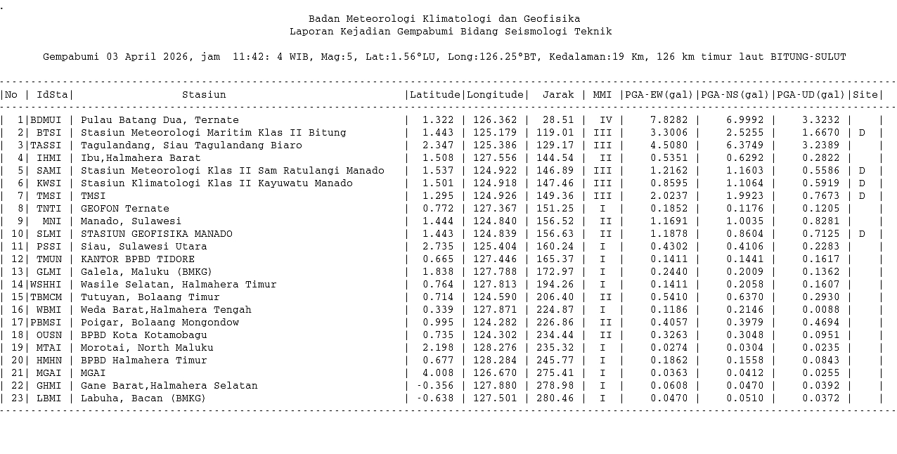 Info Gempa Mag:5.2, 03-Apr-26 11:42:04 WIB, Lok:1.44 LU, 126.26 BT (126 km Timur BITUNG-SULUT), Kedlmn:17 Km ::BMKG