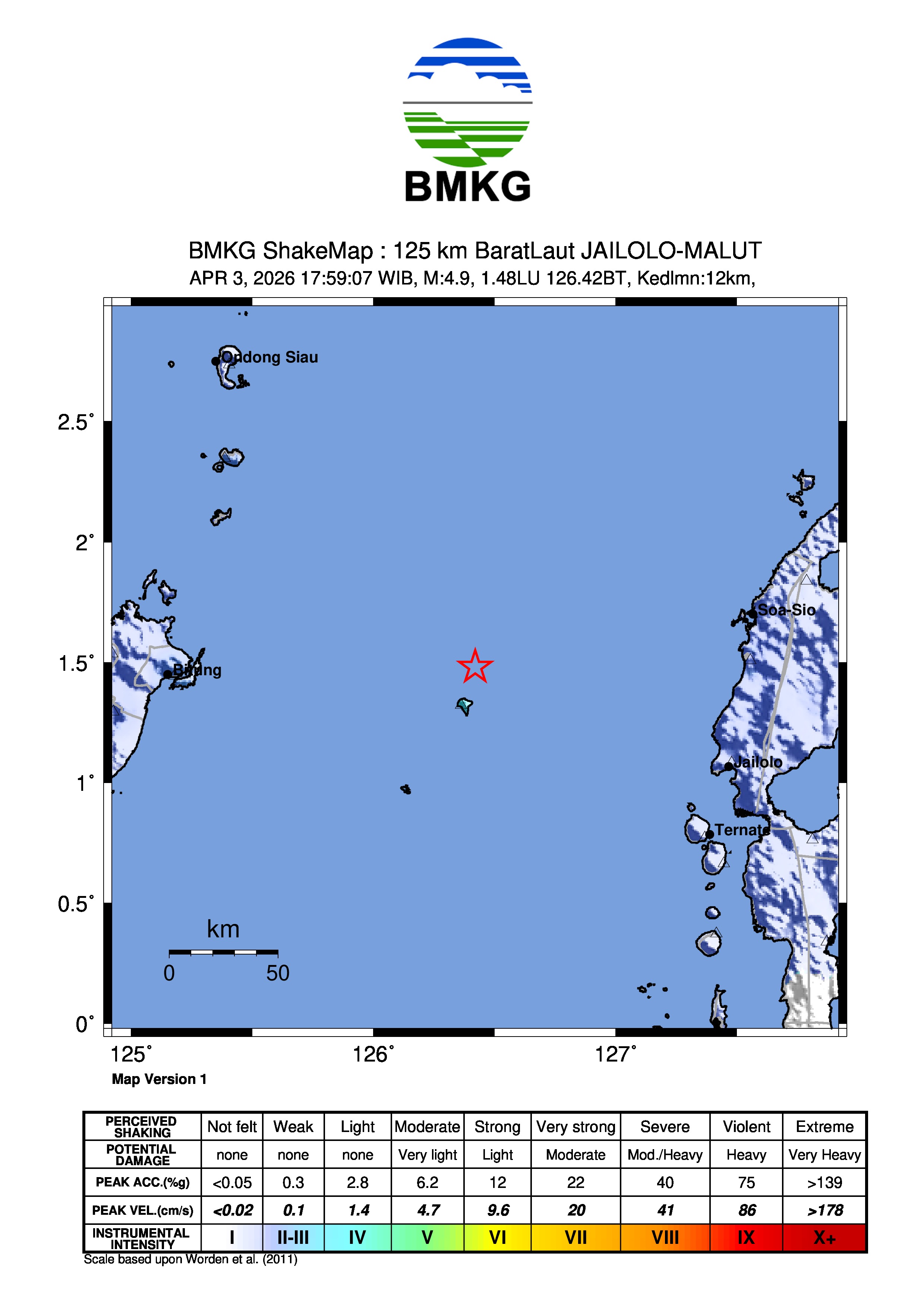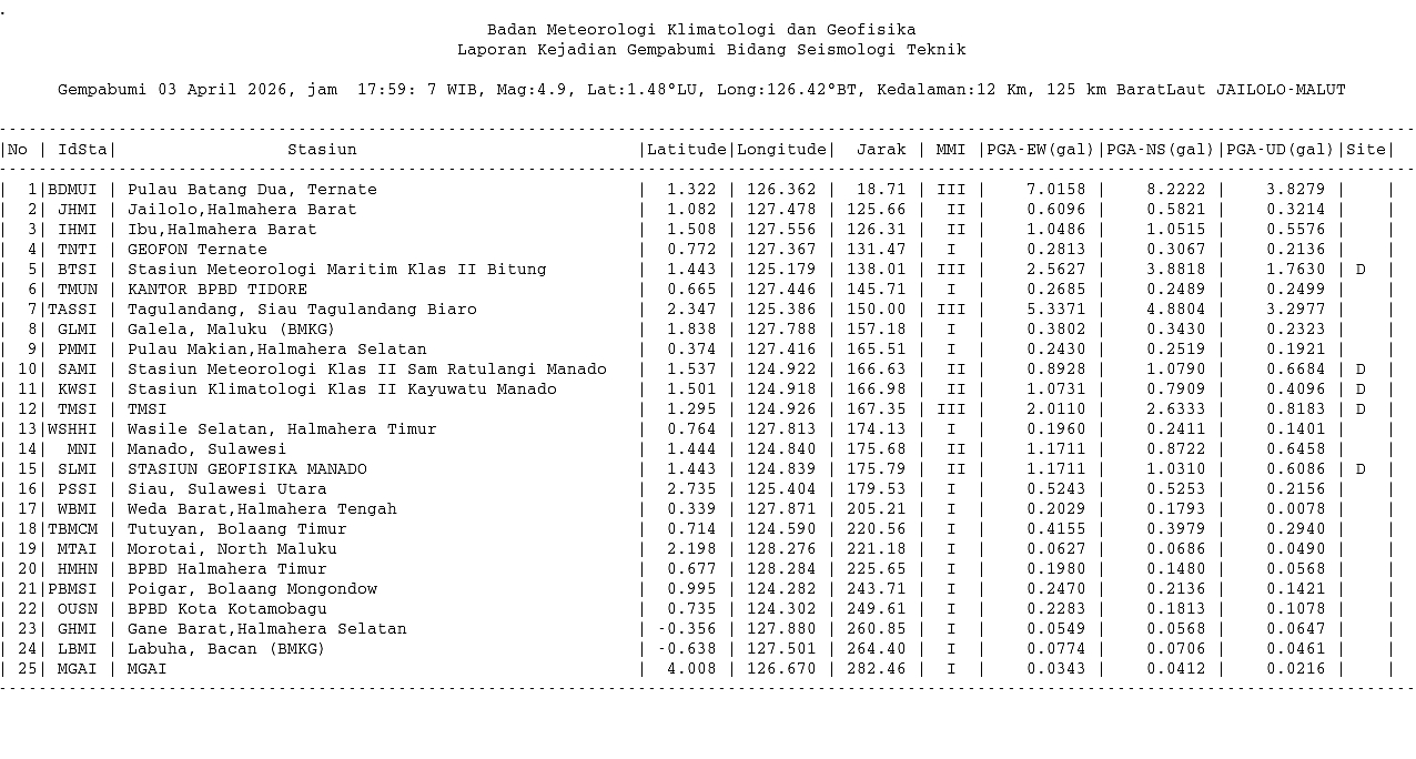 Info Gempa Mag:5.0, 03-Apr-26 17:59:05 WIB, Lok:1.46 LU, 126.37 BT (129 km BaratLaut JAILOLO-MALUT), Kedlmn:10 Km ::BMKG