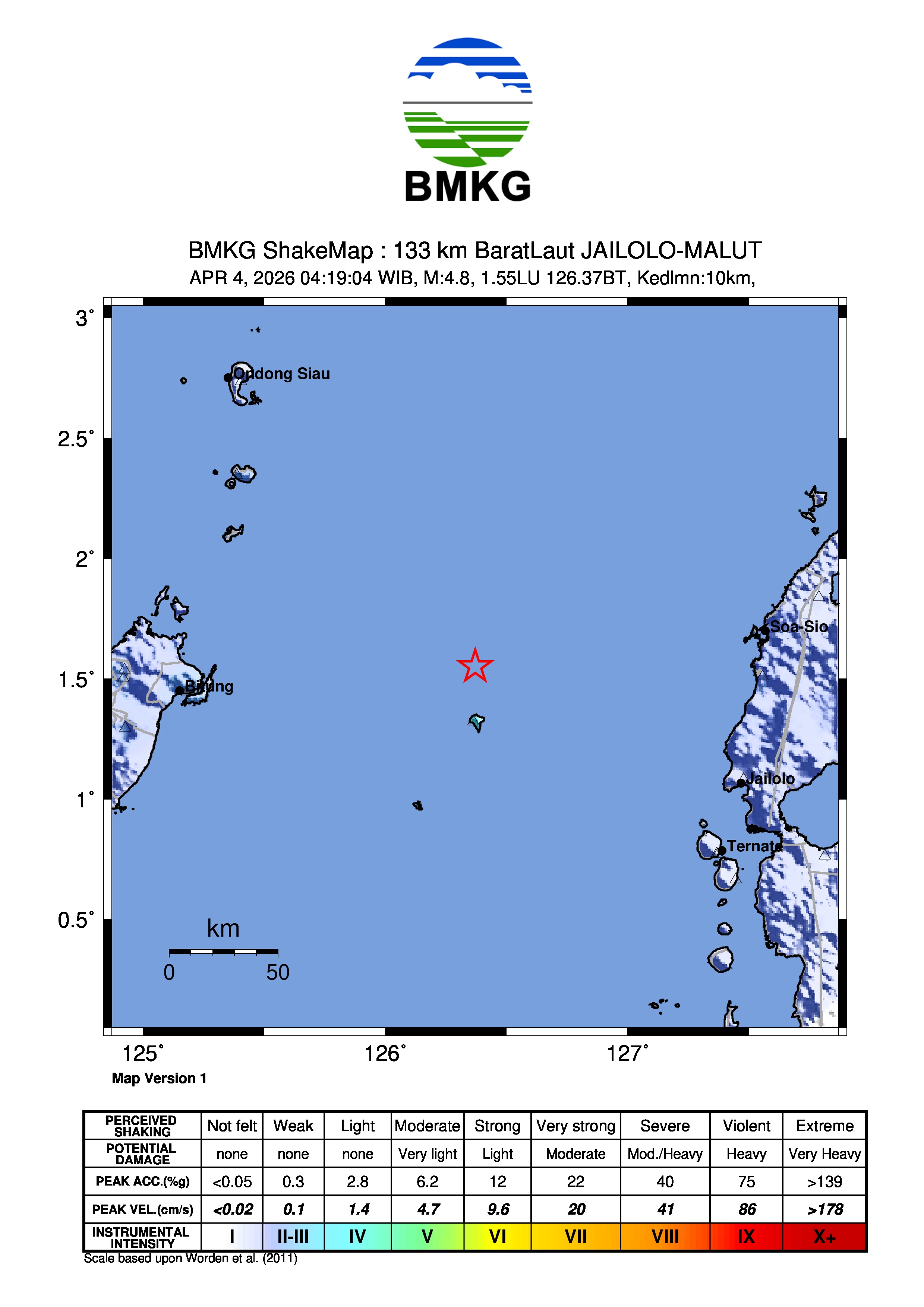 Info Gempa Mag:5.0, 04-Apr-26 04:19:04 WIB, Lok:1.53 LU, 126.34 BT (135 km BaratLaut JAILOLO-MALUT), Kedlmn:10 Km ::BMKG