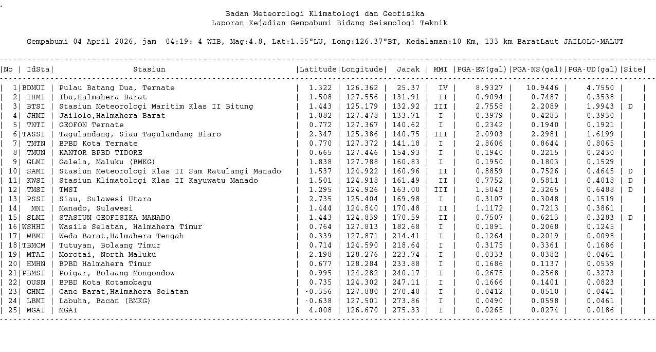 Detail Event — 20260404042147 - Info Gempa Mag:5.0, 04-Apr-26 04:19:04 WIB, Lok:1.53 LU, 126.34 BT (135 km BaratLaut JAILOLO-MALUT), Kedlmn:10 Km ::BMKG