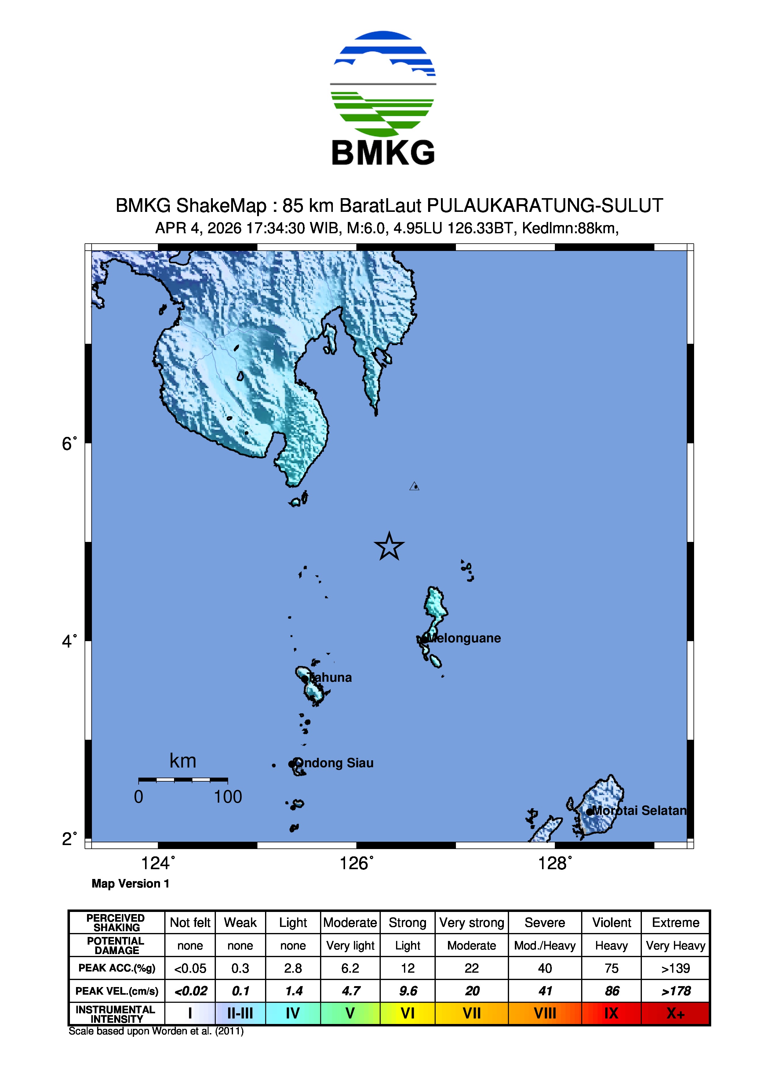 Detail Event — 20260404173703 - Info Gempa Mag:6.2, 04-Apr-26 17:34:30 WIB, Lok:4.90 LU, 126.29 BT (89 km BaratLaut PULAUKARATUNG-SULUT), Kedlmn:31 Km ::BMKG