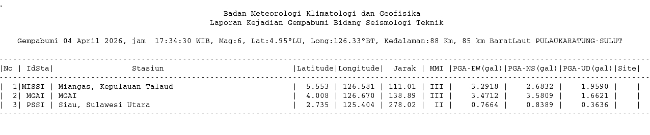 Info Gempa Mag:6.2, 04-Apr-26 17:34:30 WIB, Lok:4.90 LU, 126.29 BT (89 km BaratLaut PULAUKARATUNG-SULUT), Kedlmn:31 Km ::BMKG