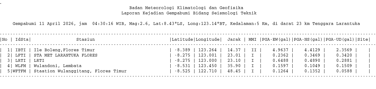 Detail Event — 20260411043016 - Info Gempa dirasakan Mag:2.6, 11-Apr-26 04:30:16 WIB, Lok:8.43 LS, 123.14 BT (Pusat gempa berada di darat 23 km Tenggara Larantuka), Kedlmn:5 Km ::BMKG