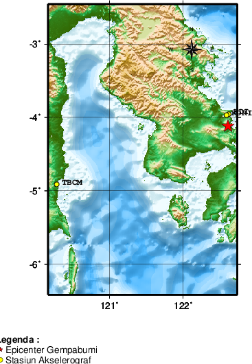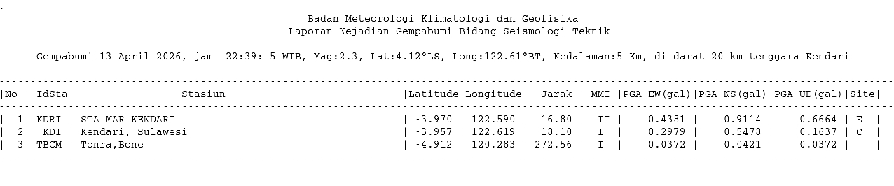 Info Gempa dirasakan Mag:2.3, 13-Apr-26 22:39:05 WIB, Lok:4.12 LS, 122.61 BT (Pusat gempa berada di darat 20 km tenggara Kendari), Kedlmn:5 Km ::BMKG