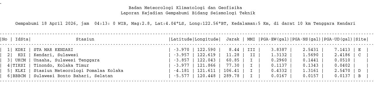 Detail Event — 20260418041300 - Info Gempa dirasakan Mag:2.8, 18-Apr-26 04:13:00 WIB, Lok:4.04 LS, 122.56 BT (Pusat gempa berada di darat 10 km Tenggara Kendari), Kedlmn:5 Km ::BMKG