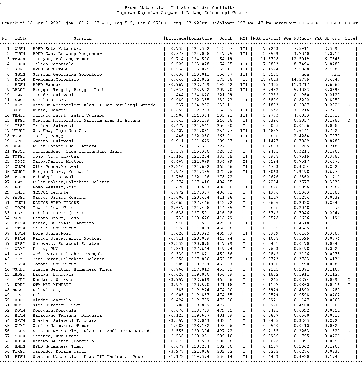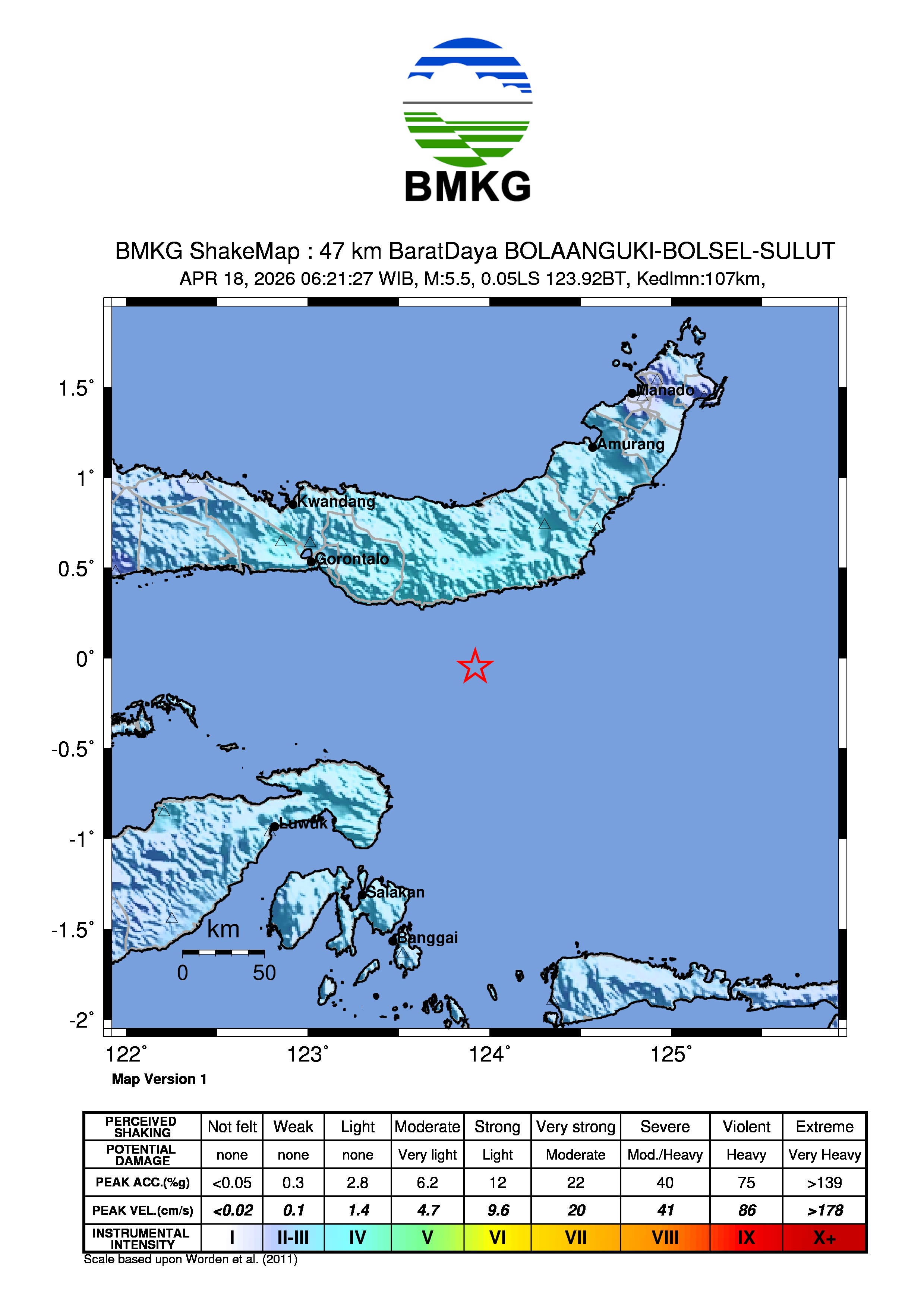 Info Gempa dirasakan Mag:5.8, 18-Apr-26 06:21:27 WIB, Lok:0.10 LS, 123.90 BT (Pusat gempa berada di laut 53 km barat daya Bolaanguki-BOLSEL), Kedlmn:102 Km ::BMKG