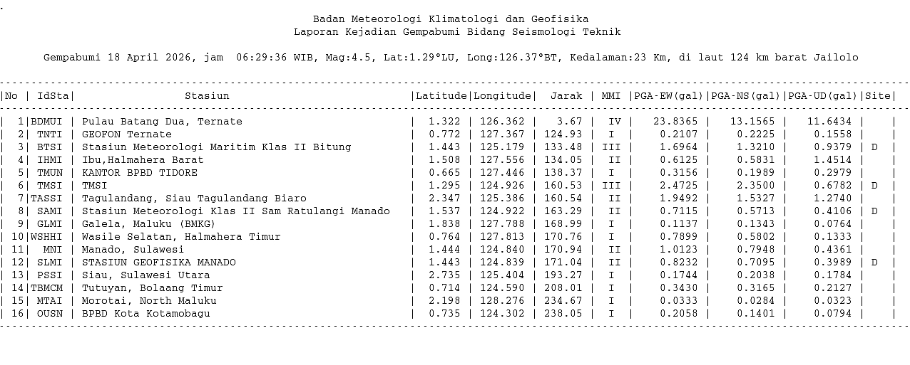Detail Event — 20260418062936 - Info Gempa dirasakan Mag:4.5, 18-Apr-26 06:29:36 WIB, Lok:1.29 LU, 126.37 BT (Pusat gempa berada di laut 124 km barat Jailolo), Kedlmn:23 Km ::BMKG